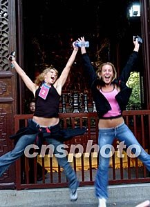 參加中國(guó)新絲路世界模特大賽的南美小姐,十月二十九日游覽杭州靈隱寺時(shí)在金剛像前歡跳。中新社記者:賈國(guó)榮