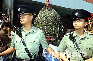 神舟五號宇宙飛船返回艙、著陸降落傘等十月三十一日運抵香港科學館。圖為香港警察嚴加保護神舟五號展品。中新社記者:潘索菲