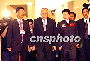 10月31日,身穿深藍色航天員制服的楊利偉在特首董建華陪同下進入禮賓府,特區(qū)政府和中聯(lián)辦官員、駐港部隊代表及各界知名人士在場歡迎。作者:洪少葵