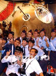 再往前,展出的就是展覽最神秘的部分──“神五”飛船返回艙、天空衣、天空食品和搭載的國旗等。在其后的正式開放參觀時,這里擠滿了小朋友,好奇地問這問那,人人顯得很興奮,都說感到自豪。