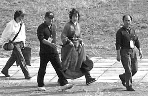 停車(chē)處與拍攝的大殿有幾百米距離,劉曉慶神態(tài)自若地與身邊人有說(shuō)有笑。她看上去只有35歲上下,扮相頗像當(dāng)年的“武媚娘”。不少游客從她對(duì)面走過(guò)時(shí),都沒(méi)認(rèn)出她就是劉曉慶。兩名專(zhuān)門(mén)從東陽(yáng)市保安服務(wù)公司聘請(qǐng)來(lái)的保鏢也無(wú)事可做,一路上幫著她的化妝師、助理拎包。直到走到大殿,劉曉慶發(fā)現(xiàn)早早埋伏的記者們舉著“長(zhǎng)槍短炮”,立刻變了臉色。保鏢和助理立刻高舉雙手阻止拍照。劉曉慶進(jìn)殿后兩名保鏢把守住前后大門(mén)。