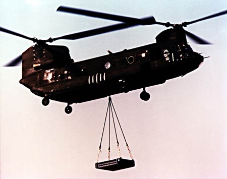 CH-47是標(biāo)準(zhǔn)的中型運(yùn)輸直升機(jī),它開發(fā)于1958年,設(shè)計要求能將2.7噸物資運(yùn)到185千米處,并重新搭載1.35噸物資不補(bǔ)加燃油飛回原出發(fā)點(diǎn)。或應(yīng)能在機(jī)外吊掛7噸物資飛到37千米外的地方卸下,并不加油飛返原地。經(jīng)競爭,波音伏托直升機(jī)公司的伏托114型方案中標(biāo),并以HC-1的舊稱號投入試制。1961年9月原型機(jī)YHC-1B試飛(后改稱CH-47A)。1962年8月服役,至今仍在生產(chǎn)、改進(jìn)和使用中。估計總產(chǎn)量為800架左右,其中有58架出口英國、加拿大和西班牙。日本仿制的型號尚未包括在內(nèi)。H-47是一種縱列雙旋翼直升機(jī),近短形截面的機(jī)身頭部是駕駛艙,中段是長9.15米、高1.98米的大型主艙,可容44名士兵或27名傘兵或24副擔(dān)架,地板上設(shè)系留點(diǎn)91個,可一次運(yùn)輸一套戰(zhàn)術(shù)地對地導(dǎo)彈或2輛吉普車。為此,機(jī)尾是兼作跳板的向下翻的貨艙門,裝卸極為方便。