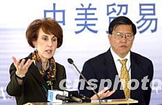 博鰲亞洲論壇2003年會(huì)十一月三日舉行中美貿(mào)易關(guān)系:挑戰(zhàn)與合作主題午餐會(huì),昔日中美貿(mào)易談判對(duì)手美國(guó)前貿(mào)易代表巴舍夫斯基與現(xiàn)任博鰲亞洲論壇秘書長(zhǎng)的龍永圖再度相遇,以論壇的形式共同探討中美貿(mào)易關(guān)系。中新社記者:毛建軍