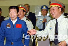 楊利偉與中國首次載人航天飛行代表團(tuán)受到駐港部隊(duì)司令員王繼堂、政委王玉發(fā)和官兵們的熱烈歡迎。