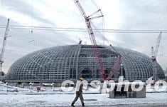六日晚至七日晨,一場大雪突襲北京。正在建設的國家大劇院穹形屋頂鋼結(jié)構(gòu)骨架被大雪覆蓋,安裝焊接工作被迫暫停。中新社記者:張煒