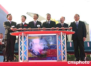五日在澳門金蓮花廣場舉行“國家首飛航天員楊利偉和載人中國載人航天代表團訪澳歡迎儀式暨中國首次載人航天飛行展開幕典禮”盛大儀式,圖為澳門特區(qū)行政長官何厚鏵、全國政協(xié)副主席馬萬祺、楊利偉等主持開幕儀式。中新社記者:李剛