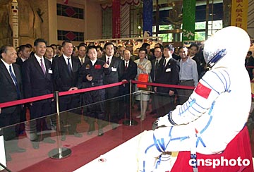 澳門特區(qū)行政長官何厚鏵、全國政協(xié)副主席馬萬祺、中央駐澳聯(lián)絡辦主任白志健等五日參觀澳門特區(qū)政府舉辦的「中國首次載人航天飛行展」時聽取楊利偉的介紹。中新社記者:李剛