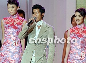 香港藝員陳煒11月8日晚出席在香港會(huì)展中心舉行的“2003中華小姐環(huán)球大賽”總決賽頒獎(jiǎng)儀式。中新社記者:錢興強(qiáng)