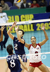 2003年11月9日,第九屆女排世界杯賽在日本舉行。多米尼加隊(duì)9號(hào)隊(duì)員阿里亞斯被查出服用興奮劑。圖為11月3日阿里亞斯(右)在同中國隊(duì)的比賽時(shí)準(zhǔn)備攔網(wǎng)。中體在線/供圖