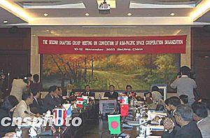 來自孟加拉國、巴西、中國、韓國、伊朗、馬來西亞、蒙古、秘魯、菲律賓、俄羅斯、泰國、巴基斯坦、烏克蘭等十五個國家的政府官員,以及聯(lián)合國有關(guān)機構(gòu)的代表和觀察員出席亞太空間合作組織第二次章程起草會議。中國國家航天局局長欒恩杰致辭時說,中國政府將一如既往地支持亞太空間合作組織的建立及所開展的合作,希望亞太空間合作組織早日建立。
