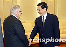 胡錦濤今天在人民大會堂會見了美國前國務卿基辛格博士,賓主進行了友好交談。胡錦濤對基辛格長期致力于中美友好、為中美關系正;鞒龅臍v史性貢獻表示贊賞。