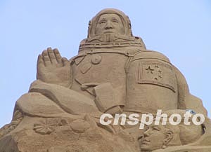 首屆?趪H沙雕賽十一月十五日在海口市西海岸大海邊開雕。來自中國、美國、西班牙等七個國家的數(shù)十名沙雕藝術(shù)家們參加本次比賽。圖為中國藝術(shù)家們雕刻的航天英雄楊利偉形象。中新社記者:王辛莉