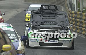 澳門第五十屆格蘭披治大賽車十六日進(jìn)行的比賽中,一輛賽車的引擎蓋突然掀開,該車手竟奇跡般的將賽車開回發(fā)車點(diǎn)。中新社記者:李剛