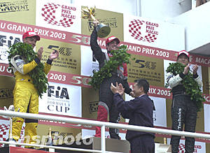 澳門第五十屆格蘭披治大賽車十六日舉行最精彩的三級(jí)方程式大賽,澳門特區(qū)行政長官何厚鏵賽后親自為獲得前三名的車手頒獎(jiǎng)。中新社記者:李剛