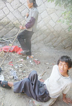 12月6日記者采訪(fǎng)了戴家。戴家的兩位老人已經(jīng)去世多年。扔下了4個(gè)殘疾孩子和老母親。戴家的長(zhǎng)子戴清鎮(zhèn),37歲,患有精神病,經(jīng)常發(fā)作。記者沒(méi)有看到他,據(jù)隨行的村干部說(shuō)他已經(jīng)離家出走多日,音訊全無(wú);二兒子戴金龍,30歲,癡呆,沒(méi)有任何勞動(dòng)能力;三兒子戴振明,28歲,小兒麻痹,完全癱瘓;四兒子戴暫缺,25歲,手拄雙拐。唯一的健全人是35歲的戴雙治。她和丈夫擔(dān)負(fù)起了照顧全家的重?fù)?dān)。