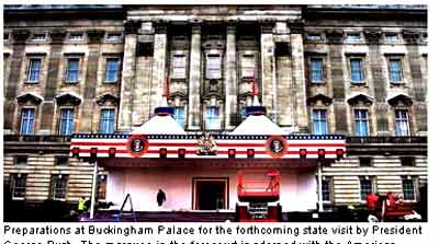 與此同時,英國人的抗議活動逐漸升級。昨天傍晚,警方逮捕了一名爬上白金漢宮大門的抗議者。她名叫林迪斯·普爾西,她在下午四點(diǎn)鐘的時候爬上大門把一幅美國國旗倒掛在上面。國旗上還寫著抗議布什訪英的標(biāo)語。她在被警方逮捕之前在大門上坐了兩個小時。