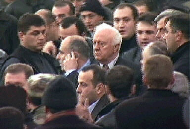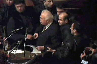 11月22日,格魯吉亞新一屆議會(huì)舉行第一次會(huì)議。當(dāng)謝瓦爾德納澤在議會(huì)演講時(shí),幾十名反對(duì)派人士沖入議會(huì)大廈,要求總統(tǒng)辭職。總統(tǒng)的支持者和反對(duì)派人士發(fā)生爭(zhēng)執(zhí),議會(huì)大廳一片混亂。謝瓦爾德納澤隨即在保鏢的保護(hù)下撤離,并表示拒絕辭職。