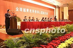 十一月二十五日,國(guó)務(wù)院僑辦主任陳玉杰在廣州東方賓館召開的全球越柬老華僑華人懇親大會(huì)上,代表中央“五僑”祝賀大會(huì)的勝利召開。中新社記者:史利