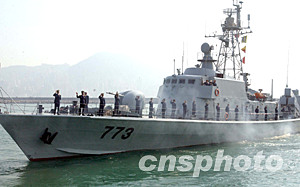 十一時二分,昂船洲軍港內(nèi)水波微泛,魚兒歡躍,在“順德”號導彈護衛(wèi)艇的率領下,包括一艘登陸艇和一艘高速巡邏艇在內(nèi)的“七七一”編隊進入基地。下午二時許“七七三”編隊離港,,返回深圳基地。