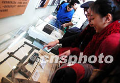 北京“井岡山大型展覽”十天引來七萬多觀眾。圖中兩位參觀的女孩正在討論眼前展品(紅軍當(dāng)年蓋房子的工具)是什麼。半個多世紀前,毛澤東等在中國南方叢山峻嶺的戰(zhàn)爭故事使許多參觀者感嘆。中新社記者:王麗南