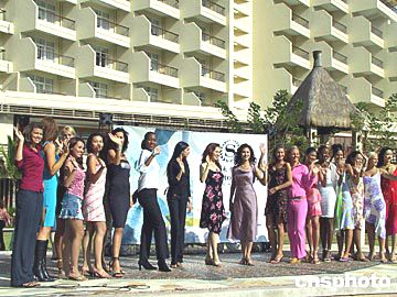 參加第五十三屆世界小姐總決賽的佳麗6日下午三時(shí)半出征,評(píng)委成龍為佳麗們鼓氣。作者:關(guān)向東