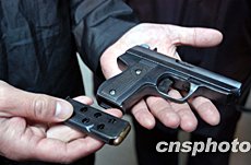 北京東城警方將持槍入室搶劫達(dá)二十一萬(wàn)元人民幣的犯罪嫌疑人蔡某(男)及同案犯押解回京,并收繳案犯使用的仿64式真彈手槍及子彈。中新社記者:任海霞