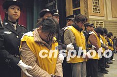 北京警方十二月九日對在冬季百日會戰(zhàn)以來查處的聚眾賭博、吸毒販毒、制假販假等五十余名違法犯罪人員進(jìn)行公開處理。中新社記者:任海霞