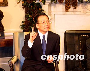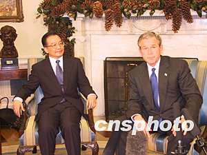 當(dāng)天上午的歡迎儀式后,溫家寶與布什先進(jìn)行了小范圍會(huì)談,會(huì)見(jiàn)了記者,然后雙方又進(jìn)行了大范圍會(huì)談,就中美關(guān)系和一些重大國(guó)際問(wèn)題交換了看法。