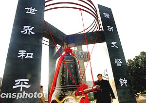 中新社南京十二月十一日電(記者 陳光明)今天,為悼念南京大屠殺同胞遇難六十六周年而鑄造的“和平大鐘”在南京江東門侵華日軍南京大屠殺遇難同胞紀念館安裝完畢。明天起,“悼念南京大屠殺三十萬同胞遇難六十六周年儀式暨南京國際和平日集會”系列活動將陸續(xù)舉行。
