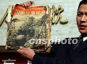 也在今天,幾本揭露當年侵華日軍罪行的畫冊由溫州晚報社贈送給抗戰(zhàn)紀念館。這家報社的編輯周麗峰介紹,這幾本發(fā)黃的《支那事變畫報》系日本朝日新聞社出版,今年十一月被溫州經營紙盒加工的企業(yè)從進口的日本廢紙中發(fā)現,畫冊中報道了一九三七年以后日軍在北平、天津、漢口、安慶等地的一系列軍事行動。