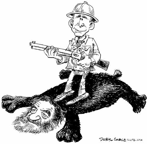 布什拿著槍,踩著薩達(dá)姆這只“大熊”。