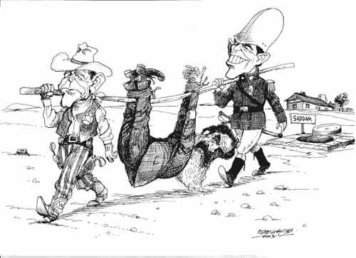 前為美國總統(tǒng)布什,后為英國首相布萊爾,看著薩達(dá)姆這個大“獵物”。原載奧地利《Kleine Zeitung》報