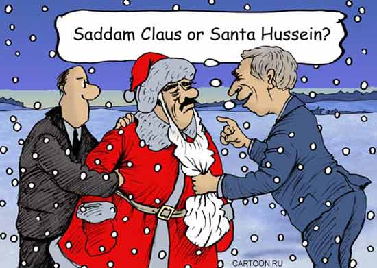 布什:“我都搞不清你是圣誕老人還是薩達(dá)姆了!”。(編者注:有觀察家指出,薩達(dá)姆的被捕,對布什而言是一份天大的圣誕節(jié)禮物),原載俄羅斯圣彼得堡市《Obshaya Gazeta》報