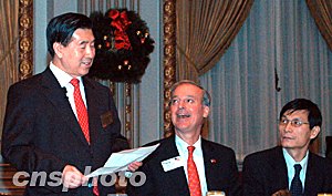 中國(guó)人壽董事長(zhǎng)王憲章(左)向紐約證交所董事會(huì)臨時(shí)主席兼首席執(zhí)行官約翰·里德(中)、國(guó)壽上市案的全球聯(lián)席協(xié)調(diào)人——中國(guó)國(guó)際金融有限公司代表朱云來(右)等致辭。