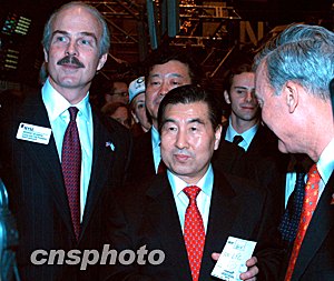 中國(guó)人壽董事長(zhǎng)王憲章(中)在紐約證交所董事會(huì)臨時(shí)主席兼首席執(zhí)行官約翰·里德(右)等陪同下,在交易大廳中以首日開盤價(jià)二十三點(diǎn)二五美元,購(gòu)買了一百股國(guó)壽股票。