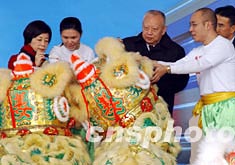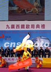 香港特區(qū)行政長官董建華、環(huán)境運(yùn)輸及工務(wù)局局長廖秀冬,12月20日在九廣西鐵啟用典禮上主持啟用儀式為醒獅點(diǎn)睛。中新社記者:洪少葵