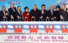 香港九廣西鐵12月20日正式通車,圖為行政長官董建華、環(huán)境運(yùn)輸及工務(wù)局局長廖秀冬、九廣鐵路主席田北辰等嘉賓在錦上路站主持啟用儀式。中新社記者:洪少葵