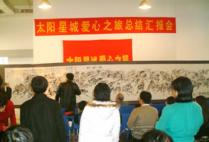 太陽星城愛心之旅隨團(tuán)著名畫家李繁民,傾心力作了八米巨畫《中華五十六駿圖》贈送給香港冠城集團(tuán),以表達(dá)對企業(yè)支持愛心事業(yè)謝意。石家莊殘聯(lián)理事長王金斗專程從河北趕來,代表石家莊市30萬殘疾人對太陽星城愛心之旅采訪團(tuán)的奉獻(xiàn)精神表示感謝。在報(bào)告會舉行之際,太陽星城愛心之旅所到之處的各級殘聯(lián)、志愿者組織和愛心人士發(fā)來了一百多封賀信。