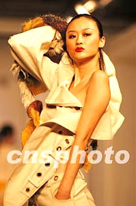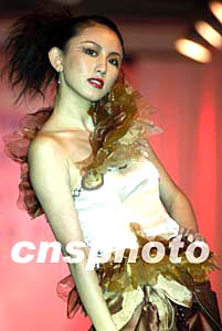 二十四日下午,在二零零三中國(guó)國(guó)際時(shí)裝周獲得大獎(jiǎng)的幾位廣東著名服裝設(shè)計(jì)師在廣州舉辦匯報(bào)演出,展示獲獎(jiǎng)作品中的一款別致女裝。作者:柯小軍