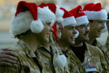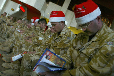 12月24日,在伊拉克南部城市巴士拉國際機(jī)場的英軍基地,駐伊英軍集體歡度圣誕平安夜。