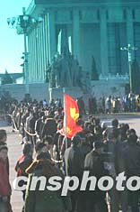 十二月二十六日,在毛主席誕辰110周年之日,北京市民冒著嚴(yán)寒來(lái)到毛主席紀(jì)念堂瞻仰毛主席遺容。中新社記者:史利