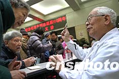 當(dāng)年曾是毛主席醫(yī)療小組成員的王新德教授(右)十二月二十六日在北京醫(yī)院用為市民們義診來(lái)紀(jì)念毛主席誕辰110周年。中新社記者:史利