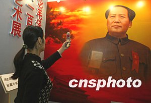 十二月二十七日,在北京毛主席紀(jì)念堂舉行的紀(jì)念毛澤東誕辰110周年書(shū)畫(huà)藝術(shù)展不但吸引了眾多老年人,也令不少年輕人流連忘返。一名女青年用新購(gòu)買(mǎi)的可拍照手機(jī)拍攝令人著迷的毛澤東像。中新社記者:任晨鳴