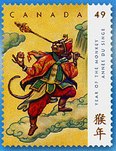 發(fā)行的2款猴年郵票取材于中國(guó)古典名著“西游記”故事中的美猴王孫悟空。面值49加分國(guó)內(nèi)郵資郵票發(fā)行量800萬(wàn)張,面值1.4加元國(guó)際郵資郵票發(fā)行量170萬(wàn)張。畫(huà)面分別是陪同唐僧去“西天”取經(jīng)途中手執(zhí)金箍棒騰云駕霧的孫悟空和與玉皇大帝智斗鬧天空的孫悟空。該組郵票設(shè)計(jì)者為安大略藝術(shù)學(xué)院畢業(yè)的路易斯費(fèi)肖夫,他曾設(shè)計(jì)許多加拿大郵票圖案。