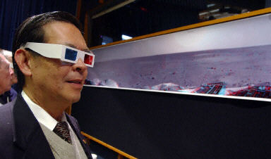 1月5日,在美國加利福尼亞州帕薩迪納的宇航局噴氣推進實驗室,彼特博士配戴著立體眼鏡觀看“勇氣”號火星探測器搭載的照相機拍攝的三維圖像。