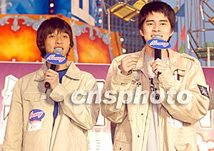 組合Shine兩人1月6日在香港金鐘添馬艦舉行之《環(huán)球嘉年華2003/4》出席「Neway終極K Fun嘉年華」演唱會(huì)作表演嘉賓,并呼吁歌迷上臺(tái)游戲。作者:鄧慶樂(lè)