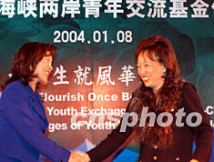 一月八日,全國青聯(lián)中華青年交流中心成立暨建立海峽兩岸青年交流基金儀式在北京舉行。全國青聯(lián)中華青年交流中心主任呂虹(左)與香港青年協(xié)會(huì)總干事王(草字頭下加易)鳴(右)簽署“中華青年領(lǐng)袖培訓(xùn)計(jì)劃”合作意向書后相互祝賀。中新社記者:任海霞