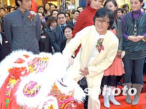 影星成龍1月9日在香港銅鑼灣出席英皇鐘表珠寶分店開(kāi)幕禮,為助興的醒獅進(jìn)行點(diǎn)睛儀式。中新社記者:鄧慶樂(lè)