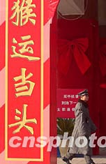 中國傳統(tǒng)農(nóng)歷猴年來臨之際,一家大型商場(chǎng)打出“猴運(yùn)當(dāng)頭”(諧音“鴻運(yùn)當(dāng)頭”)的賀歲標(biāo)語。隨著春節(jié)臨近,北京街頭大紅燈籠和賀歲標(biāo)語比比皆是。中新社記者:張煒