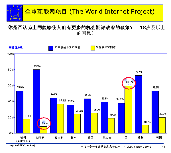 這里唯一的例外是中國,雖然由于提問方式的不同,中國的問卷沒有給出中間選項(xiàng),這種強(qiáng)制性的提問方式會(huì)增加回答者的總數(shù),但是,中國持贊成態(tài)度的網(wǎng)民要多于持反對(duì)態(tài)度的網(wǎng)民則是不爭的事實(shí),顯示出網(wǎng)民對(duì)網(wǎng)絡(luò)的政治監(jiān)督作用的有一種強(qiáng)烈的期待。這一結(jié)論和兩年前的調(diào)查結(jié)果完全吻合。